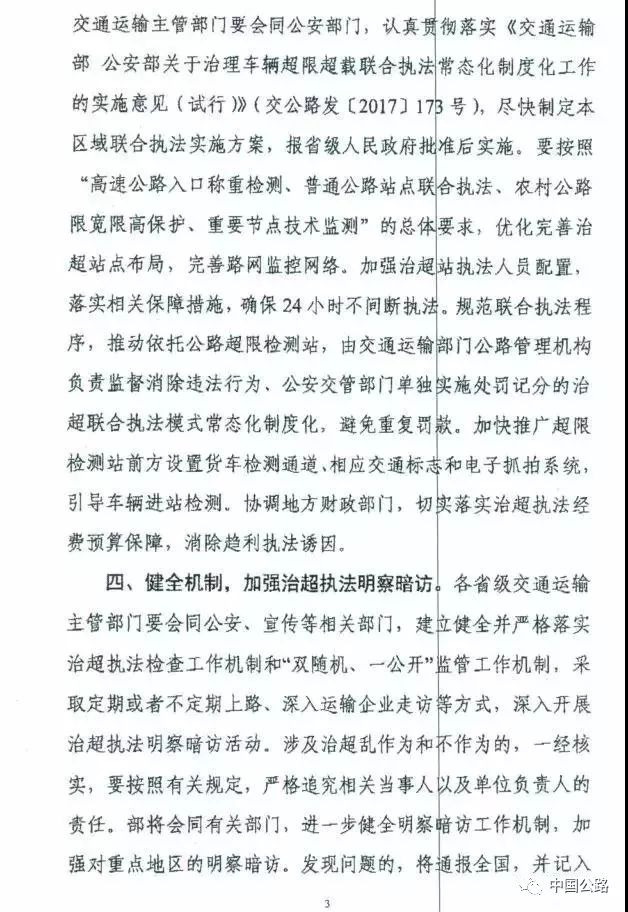 四、健全機制,加強治超執(zhí)法明察暗訪。各省級交通運輸主管部門要會同公安、宣傳等相關(guān)部門,建立健全并嚴格落實治超執(zhí)法檢查工作機制和“雙隨機、一公開”監(jiān)管工作機制,采取定期或者不定期上路、深入運輸企業(yè)走訪等方式,深入開展治超執(zhí)法明察暗訪活動。涉及治超亂作為和不作為的,一經(jīng)核實,要接照有關(guān)規(guī)定,嚴格迫究相關(guān)當事人以及單位負責人的責任。部將會同有關(guān)部門,進一步健全明察暗訪工作機制,加強對重點地區(qū)的明察暗訪。發(fā)現(xiàn)問題的,將通報全國,并記入“十三五”國檢考核成績。